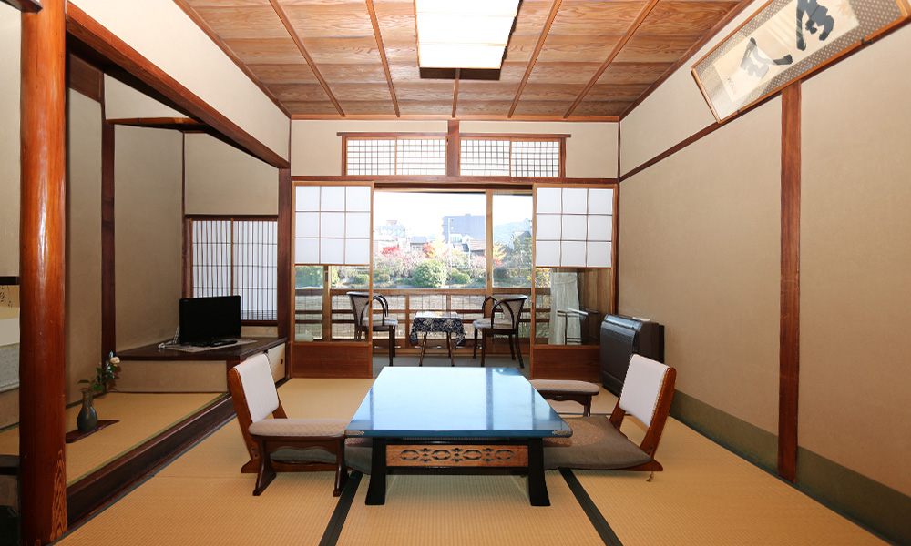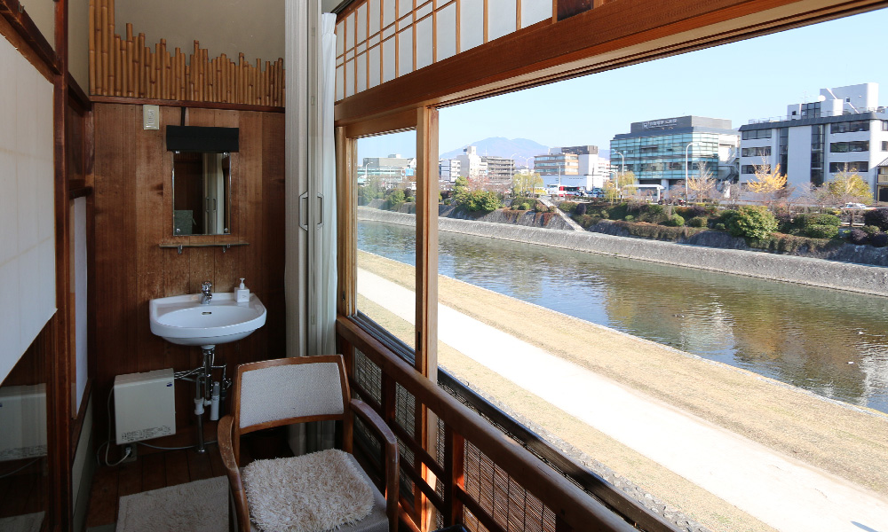 2階にある鴨川べりのお部屋です。お部屋の欄干の下には、先斗町のシンボル千鳥の透かし彫りがほどこされています。