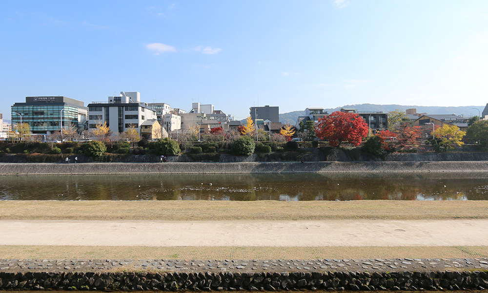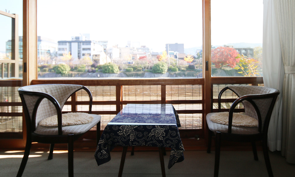 鴨川べりのお部屋からは、窓一面に春はしだれ桜、夏は澄んだ鴨川の流れ、秋は紅葉、