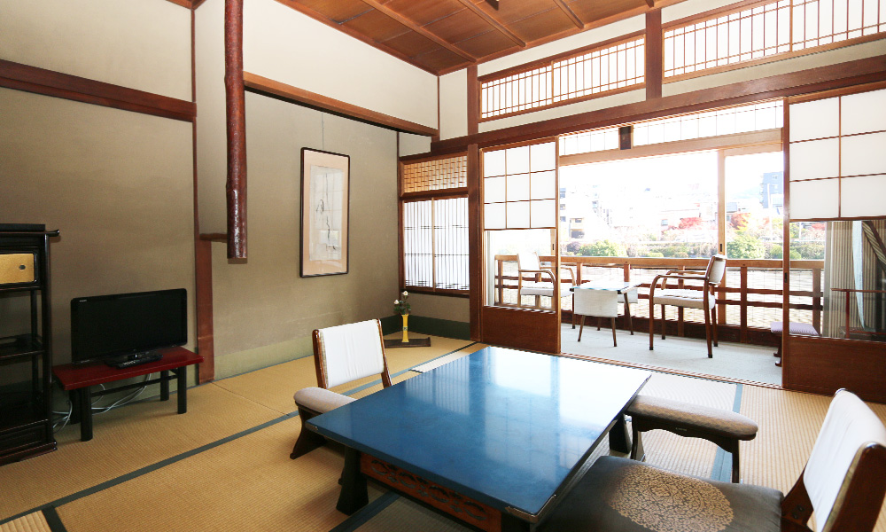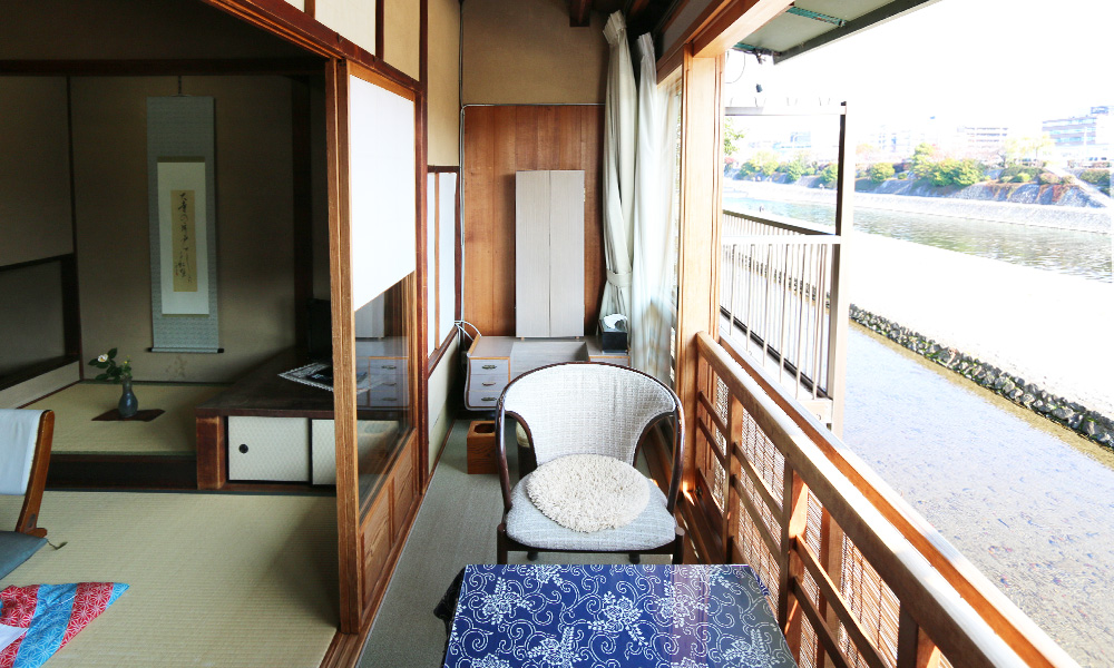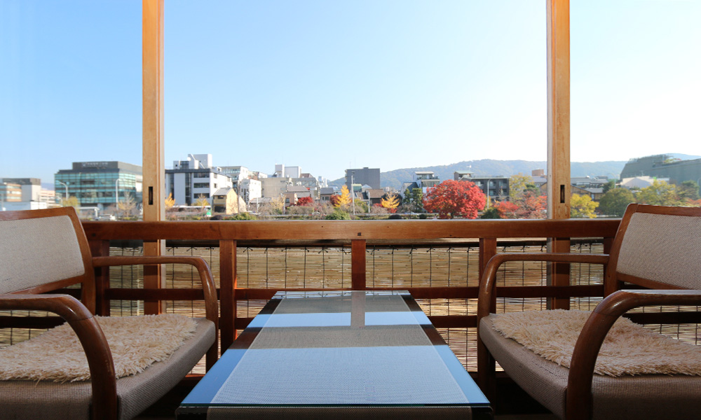 2階にある鴨川べりのお部屋です。お部屋の欄干の下には、先斗町のシンボル千鳥の透かし彫りがほどこされています。
